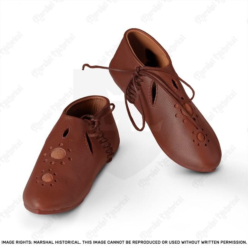 EN: Crossbowman Shoes with Cutouts 13th Century Brown 40. Medieval 13th-century footwear made of natural leather. Ideal for LARP, historical reenactment, or live role-play.